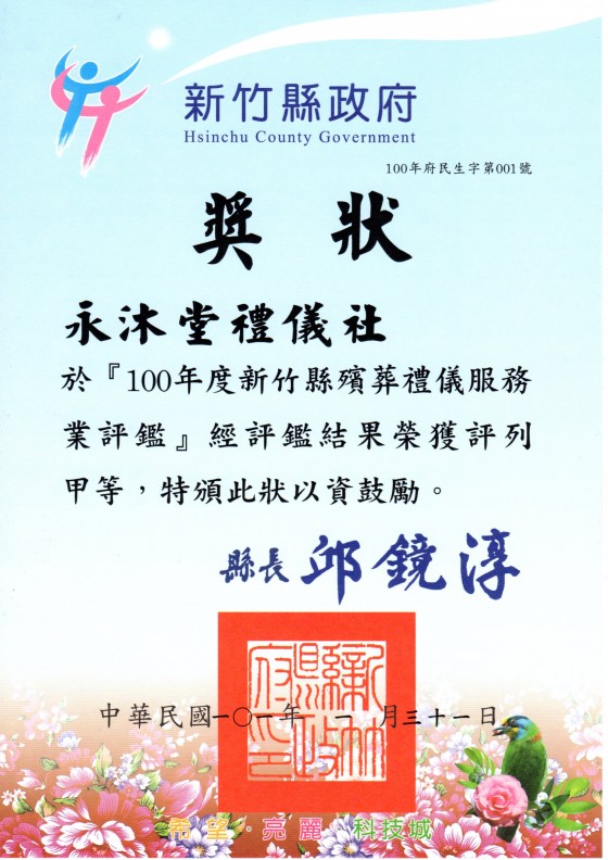100.1.31 第四度榮獲政府殯葬評鑑最優甲等 禮儀公司2012-08-29 100.1.31 第四度榮獲政府殯葬評鑑最優甲等禮儀公司 99.12.2 第3度榮獲殯葬禮儀服務評鑑最優甲等 禮儀公司2012-08-29 99.12.2 第3度榮獲殯葬禮儀服務評鑑最優甲等禮儀公司 98.12.22 第二度榮獲政府殯葬評鑑最優甲等2012-08-29 98.12.22 第二度榮獲政府殯葬評鑑最優甲等禮儀公司 96.9.7榮獲新竹縣政府頒發殯葬評鑑最優甲等獎狀一紙2012-08-29 96.9.7榮獲政府頒發喪禮服務最優甲等禮儀公司,獎狀一紙。