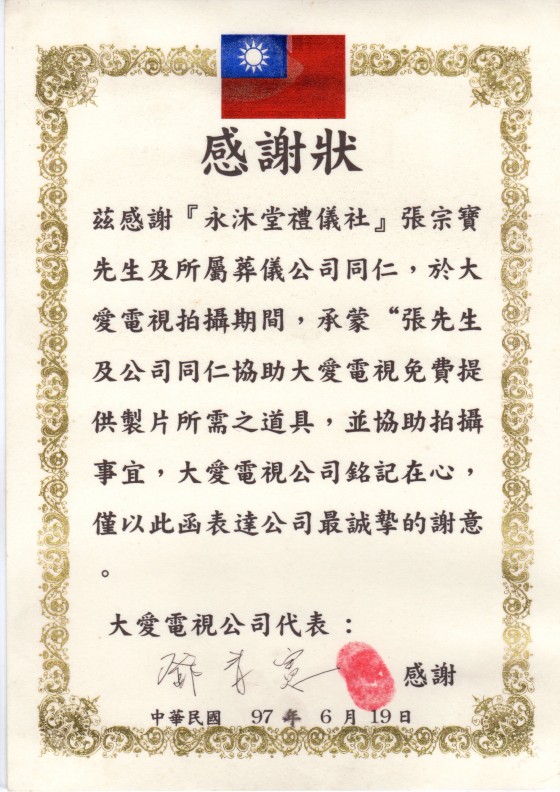 101.1.31殯葬禮儀服務喪主:柯麗雪會計師事務所感謝函2012-08-29 101.1.31殯葬禮儀服務喪主:柯麗雪會計師事務所感謝函 第一次感謝函 100.12.28 協助規劃喪禮服務或喪主頒贈感謝函一紙2012-11-19 100.12.28 協助規劃喪禮服務,喪主頒贈感謝函一紙 99.11.23 贊助長壽俱樂部 協助老人善款 榮獲感謝狀一紙2012-08-29 99.11.23 贊助長壽俱樂部 協助老人善款 榮獲感謝狀一紙 95.12.23殯葬服務協助殘障家庭募款獲牛埔北路喪主:侯雲玲頒贈感謝狀一紙2012-08-29 95.12.23殯葬服務協助殘障家庭募款獲牛埔北路喪主:侯雲玲頒贈感謝狀一紙 98.3.2協助新豐鄉喪主:廖欽盟獲贈感謝狀一紙2012-08-29 98.3.2 茲感謝『永沐堂禮儀社』張宗寶先生及所屬葬儀公司同仁,於愛妻" 張文麗 "於治喪期間,盡心盡力,協助喪家辦理後事,大德善舉,家屬銘記在心,僅以此函表達家屬最誠摯的謝意。願公司全體同仁吉祥安康、萬事順心 因喪禮規劃服務獲喪主:廖欽盟頒贈感謝狀一紙。 97.6.19獲大愛電視台頒感謝狀一紙2012-08-29 *97.6.19因協助大愛電視台拍攝大愛電視劇,獲頒大愛電視台感謝狀一紙。