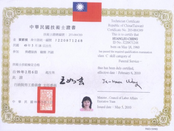 99.5.5 公司3名員工通過國家丙級喪禮服務考試通過2012-08-29 99.5.5 公司3名員工通過國家丙級喪禮服務考試通過,狂賀 公司總共有4名,國家丙級喪禮認證證書。 98.4.30通過國家級喪禮服務證照考試2012-08-29